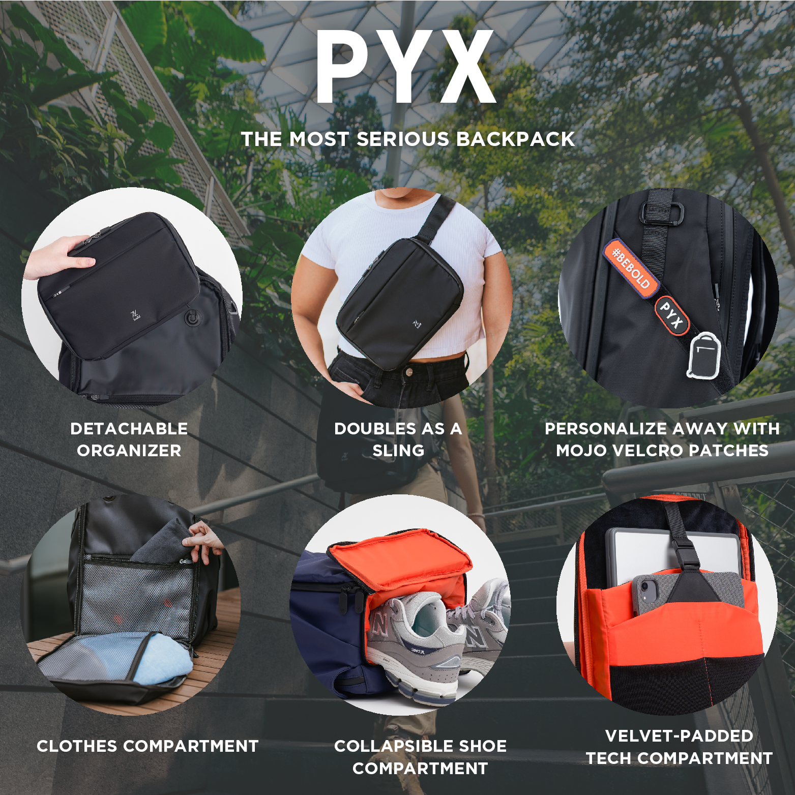 After all, this is the most serious backpack. For serious people only. Each order comes with 1 PYX Backpack and 1 Essential Organizer/Sling.